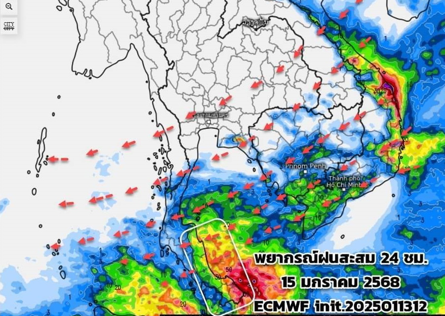 เมื่อวันที่ 25 พฤศจิกายน พยากรณ์อากาศ 24 ชั่วโมงข้างหน้า ภาคใต้ตอนล่าง โดยเฉพาะบริเวณจังหวัดพัทลุง สงขลา ปัตตานี ยะลา นราธิวาส กระบี่ ตรัง และสตูล มีฝนตกหนักหลายพื้นที่ และมีฝนตกหนักมากบางแห่ง เนื่องจากมีหย่อมความกดอากาศต่ำกำลังแรงปกคลุมบริเวณภาคใต้ตอนล่าง และประเทศมาเลเซีย ประกอบกับมรสุมตะวันออกเฉียงเหนือกำลังค่อนข้างแรงยังคงพัดปกคลุมอ่าวไทย ภาคใต้ และทะเลอันดามัน ขอให้ประชาชนในภาคใต้ตอนล่างยังคงต้องระวังอันตรายจากฝนตกหนักถึงหนักมาก ฝนที่ตกสะสม น้ำท่วมฉับพลัน น้ำป่าไหลหลาก และน้ำล้นตลิ่ง โดยเฉพาะพื้นที่ลาดเชิงเขาใกล้ทางน้ำไหลผ่านและพื้นที่ลุ่ม ส่วนคลื่นลมบริเวณอ่าวไทยมีกำลังค่อนข้างแรง บริเวณที่มีฝนฟ้าคะนองคลื่นสูงมากกว่า 3 เมตร ขอให้ประชาชนภาคใต้ฝั่งตะวันออกระวังอันตรายจากคลื่นที่ซัดเข้าหาฝั่ง ชาวเรือบริเวณอ่าวไทยและทะเลอันดามันเดินเรือด้วยความระมัดระวังและหลีกเลี่ยงการเดินเรือในบริเวณที่มีฝนฟ้าคะนอง สำหรับเรือเล็กบริเวณอ่าวไทยควรงดออกจากฝั่งต่อไปอีก 1 วัน