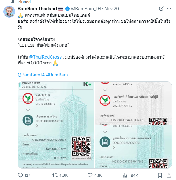 ล่าสุดเมื่อวานนี้ (26 พ.ย. 68) แอกเคานต์ BamBam Thailand ในแพลตฟอร์ม X ได้ออกมาแจ้งให้แฟน ๆ ของศิลปินเกาหลีสายเลือดไทยอย่าง แบมแบม – กันต์พิมุกต์ ภูวกุล หรือ แบมแบม GOT7 ทราบว่า ทางบ้านแฟนคลับได้ร่วมบริจาคเงินช่วยเหลือผู้ประสบภัยน้ำท่วมภาคใต้ รวมเป็นเงิน 150,000 บาท