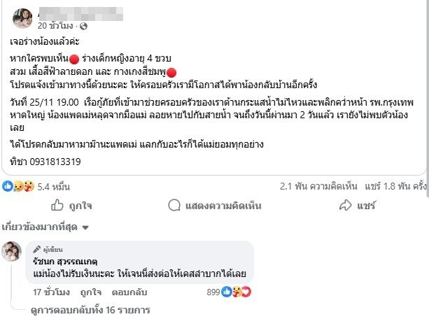 โดยจากกรณีเหตุสลด คุณแม่ท่านหนึ่งประกาศตามหา น้องแพดเม่ ลูกสาวตัวน้อย 4 ขวบ วัยกำลังน่ารัก โดยน้องหลุดจากมือแม่ ลอยหายไปกับสายน้ำ ขณะเรือกู้ภัยที่เข้ามาช่วยครอบครัวต้านกระแสน้ำไม่ไหวและพลิกคว่ำหน้า รพ.กรุงเทพหาดใหญ่ และล่าสุดพบร่างน้องสร้างความเศร้าสะเทือนใจอย่างมาก