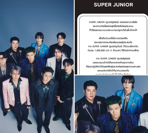 ซึ่งในเพจ SM TRUE ได้ลงรายละเอียดระบุว่า SUPER JUNIOR (ซูเปอร์จูเนียร์) ขอแสดงความเสียใจและความห่วงใยอย่างสุดซึ้งต่อพี่น้องประชาชนที่ได้รับผลกระทบจากสถานการณ์อุทกภัยในพื้นที่ภาคใต้ เพื่อเป็นส่วนหนึ่งในการช่วยเหลือและบรรเทาความเดือดร้อนของผู้ประสบภัยทาง SUPER JUNIOR (ซูเปอร์จูเนียร์) ได้ร่วมบริจาคเงินจำนวน 1,000,000 บาท ให้กับสภากาชาดไทย