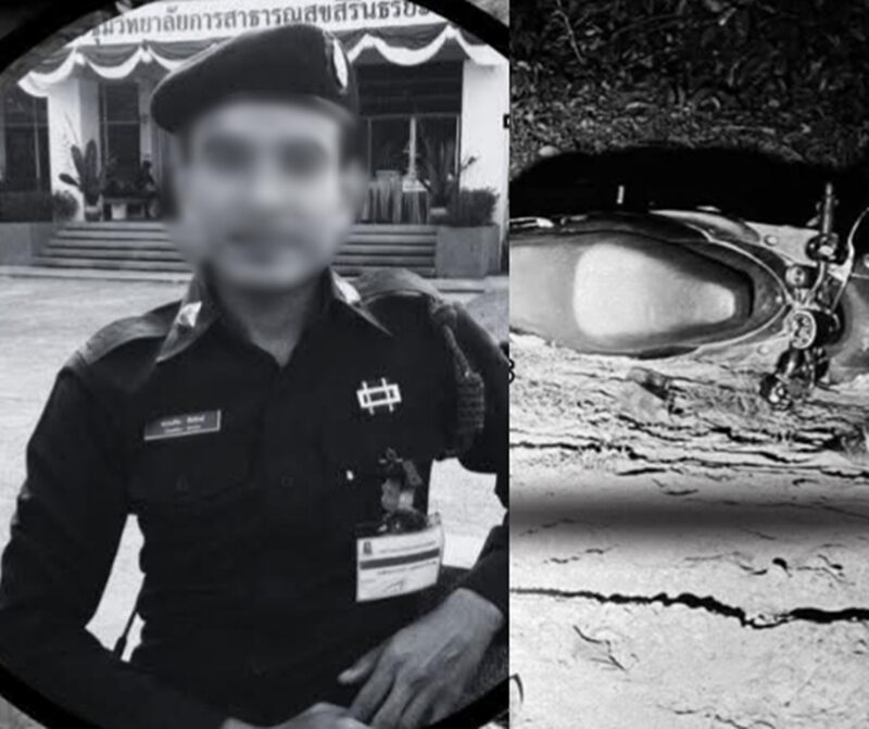 ที่เกิดเหตุพบร่างผู้เสียชีวิตชื่อ ด.ต.ชวนคิด (ขอสงวนนามสกุล) อายุ 40 ปี ข้าราชการตำรวจ โรงพักแห่งหนึ่งในพื้นที่ จ.สงขลา สภาพศพนอนคว่ำหน้า สวมเสื้อกีฬาสีม่วง สวมเสื้อยีนส์ทับ และกางเกงขาสั้นสีเทา ใกล้กันพบรถจักรยานยนต์ ยี่ห้อยามาฮ่า รุ่นฟีโน่ ทะเบียน ปัตตานี สภาพรถล้มอยู่บนถนนดิน